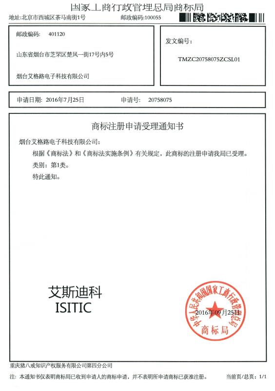 煙臺艾格路電子科技有限公司目前擁有四個注冊商標,分別是:艾格路?、艾斯迪科?,ISITIC?、tempbond?。艾格路解決方案和艾斯迪科品牌粘合劑期待著與您的溝通。